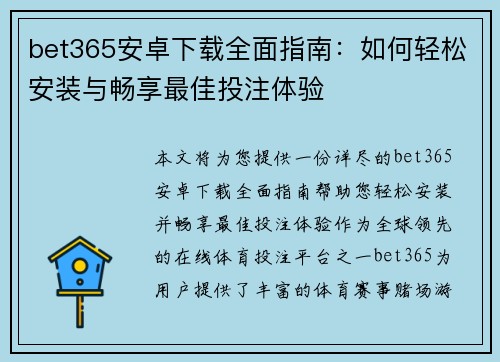 本文将为您提供一份详尽的bet365安卓下载全面指南,帮助您轻松安装并畅享最佳投注体验。作为全球领先的在线体育投注平台之一,bet365为用户提供了丰富的体育赛事、赌场游戏和其他娱乐项目。无论您是初次接触,还是已有一定经验的玩家,本文将通过四个主要方面为您详细阐述如何在安卓设备上安装bet365,并有效利用平台提供的各种功能与优势。文章内容将分为安装步骤、账户注册、投注操作和常见问题解决四个部分,每一部分都将为您提供实际操作的具体指导,让您轻松成为bet365的专业用户,享受流畅、安全的投注体验。