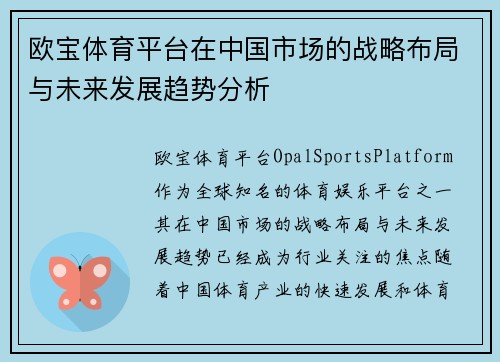 总的来说,欧宝体育平台在中国市场的战略布局具有较强的竞争力。通过精准的市场定位、创新的产品与技术应用、灵活的本地化运营策略,欧宝体育平台在中国市场取得了显著的成绩。未来,随着体育产业的不断壮大以及年轻用户群体的崛起,欧宝体育平台有望继续扩大市场份额。然而,激烈的市场竞争、政策环境的不确定性以及成本控制的挑战,也将成为平台未来发展的重要考量因素。