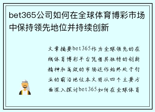 bet365作为全球领先的在线体育博彩平台,凭借其独特的创新精神和高效的市场运作,始终处于行业的前沿地位。本文将从四个主要方面深入探讨bet365如何在全球体育博彩市场中保持其领先地位并持续创新。这四个方面分别是:一、技术创新与平台优化;二、市场营销策略与品牌建设;三、合法合规性与全球扩展;四、用户体验与服务创新。通过对这些关键因素的详细分析,本文将展示bet365如何通过不断创新和适应市场需求,在激烈的竞争中占据优势,并在未来保持持续增长。